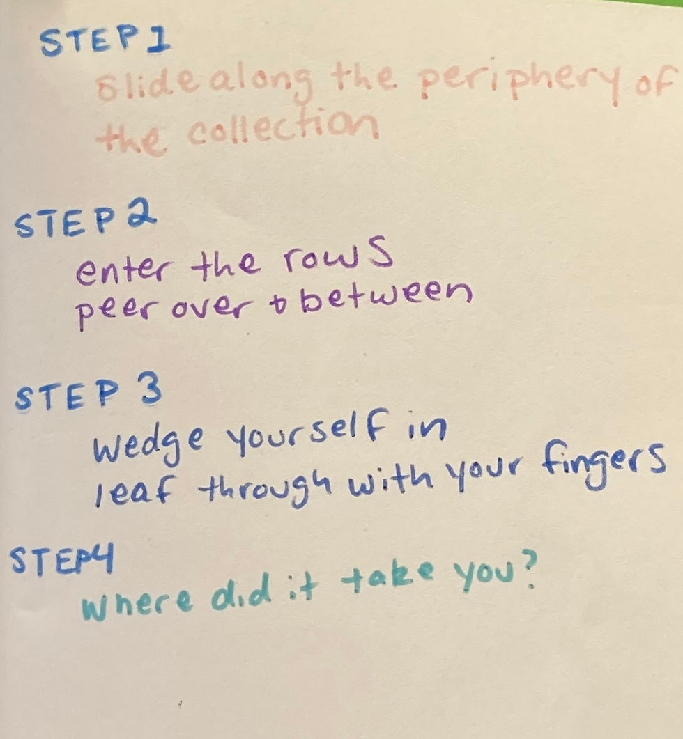 Library ScoreAug 25, 20231 min readSTEP 1 Slide along the periphery of the collectionSTEP 2 enter the rows / peer between themSTEP 3 wedge yourself in / leaf through with your fingersSTEP 4 where did it take you?